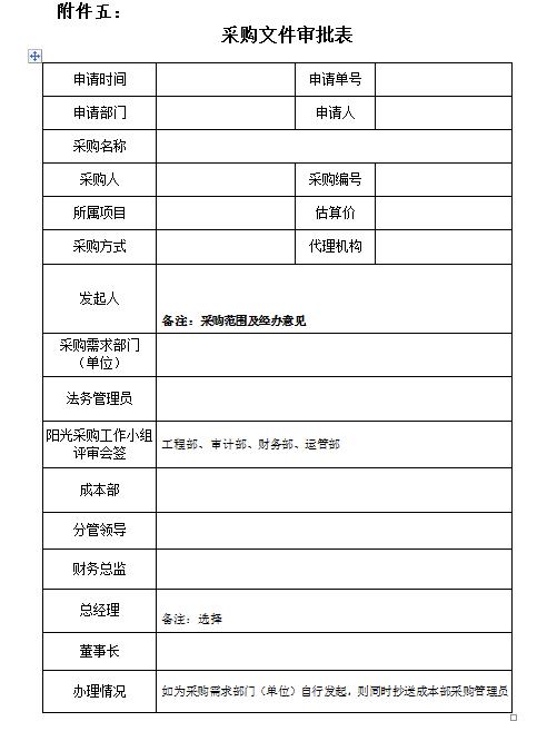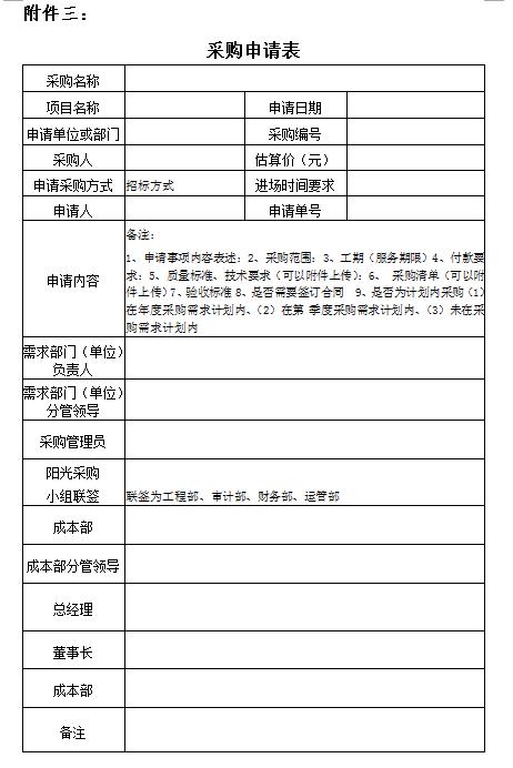 2.工作流程:需求部門(單位)提報(bào)《采購(gòu)申請(qǐng)表》,按規(guī)定程序?qū)徟ㄟ^后,由成本部委托招標(biāo)代理機(jī)構(gòu)具體實(shí)施。