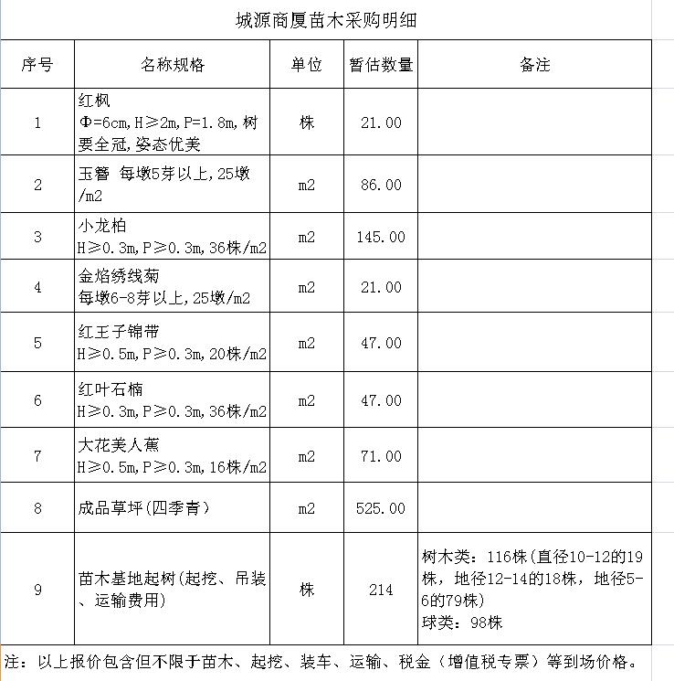 (4)采購內(nèi)容:城源商廈項目綠化苗木的采購及苗木基地樹苗的起挖、裝車并運輸?shù)焦さ刂付ǖ攸c,采購清單詳見附件。
