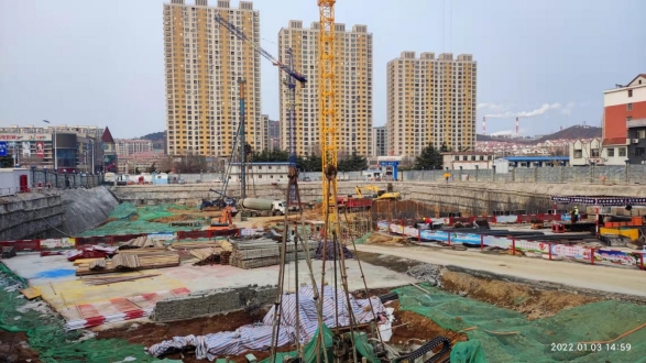 4#樓筏板基礎施工完成,正在綁扎地下2層剪力墻鋼筋及模板支護工作;
