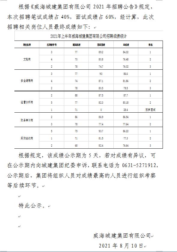 威海城建集團(tuán)2021年招聘人員面試成績(jī)及最終成績(jī)的公示